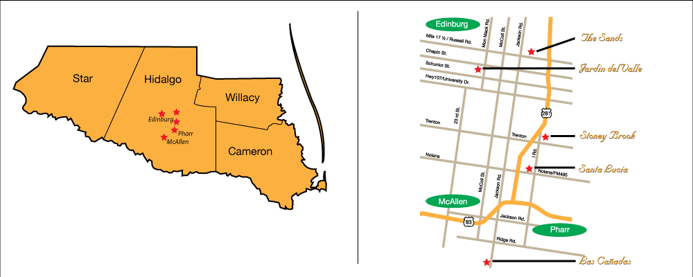 -Jardin del Valle is located north of HWY 107 on Mon Mack Rd. Minutes away from the University of Texas Pan American and major health facilities in Edinburg and McAllen.